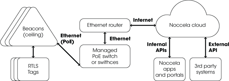 Overall, the solution works with cloud supported engine, whereas the tags are sending the positioning information to beacons, which send the information to the cloud, where the actual calculation is happening and restored for analysis and reports via third-party API.